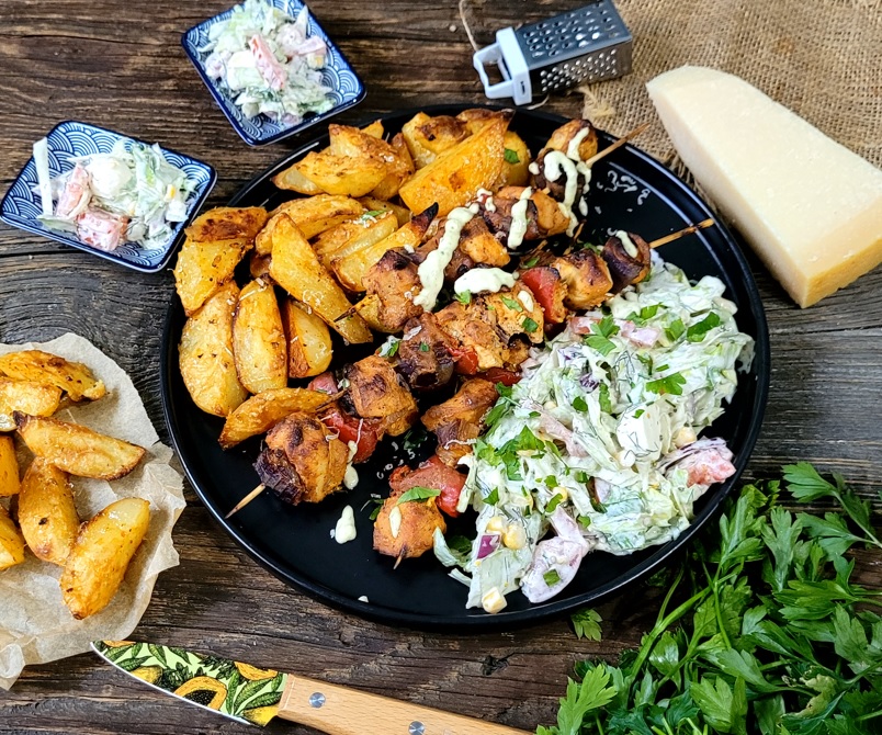 Szaszłyki z kurczaka z opiekanymi ziemniakami to świetny pomysł na obiad. Mięso i ziemniaki opiekamy w tym samym czasie w piekarniku więc jest to szybki w przygotowaniu obiad. Do tego jakaś surówka i obiad gotowy. Polecam serdecznie.